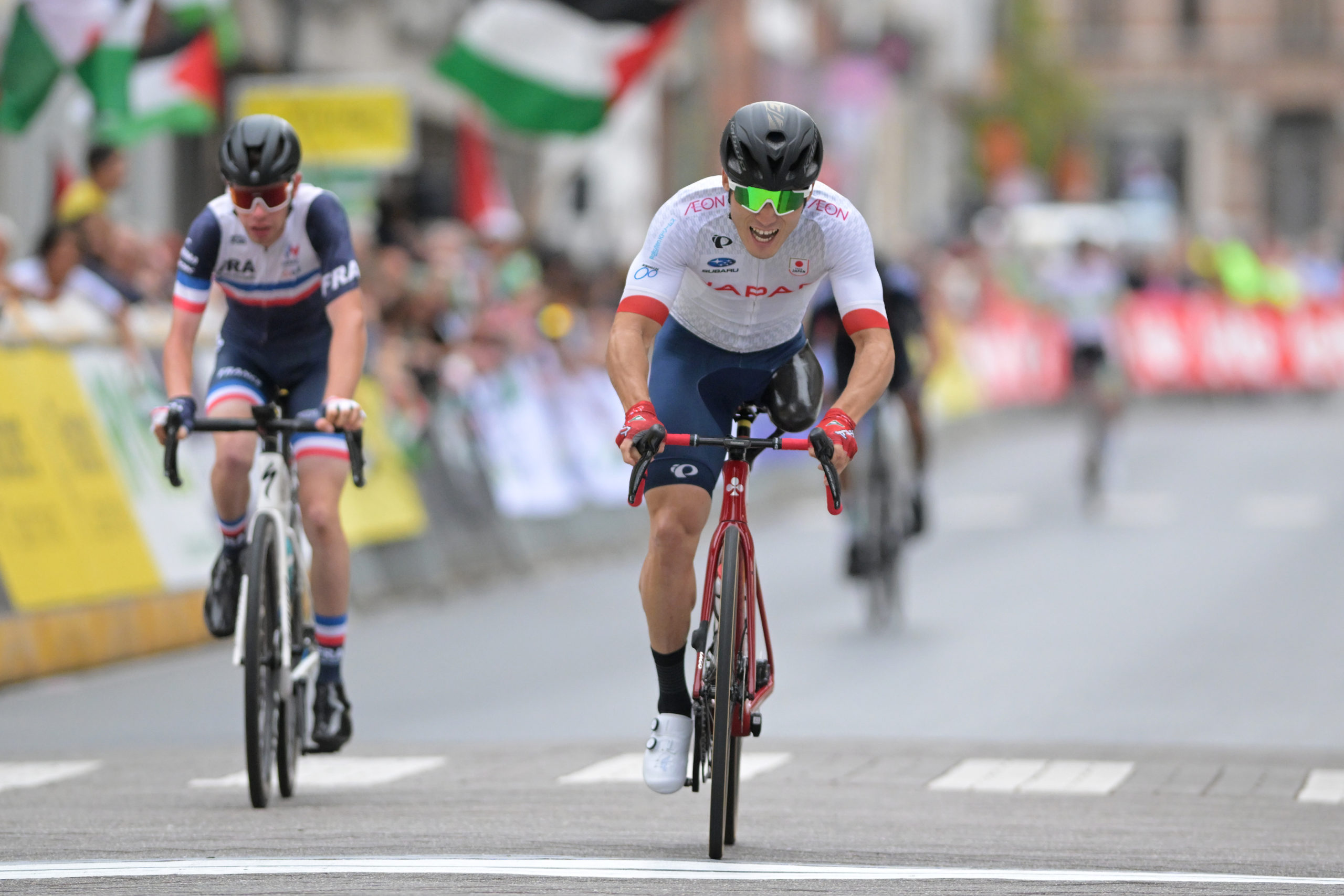 フィニッシュ直前でグループから飛び出したブール選手に反応した川本選手。しかし、伸びのあるブール選手の走りを捉えることはできませんでした。それでも、川本選手とともにブール選手に反応したシャポー選手に競り勝ち、ロード世界選手権における自己最高順位の4位入賞でレースを終えました。